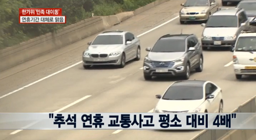 추석 연휴 교통사고 발생량이 평소의 4배라는 조사 결과가 나왔다.