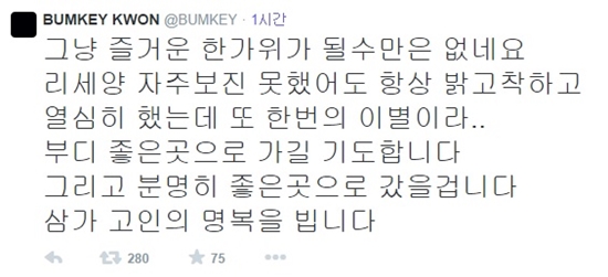 범키는 7일 자신의 SNS를 통해 “그냥 즐거운 한가위가 될수만은 없네요”라며 “리세양 자주보진 못했어도 항상 밝고 착하고 열심히 했는데 또 한 번의 이별이라..”라는 글을 게재했다.