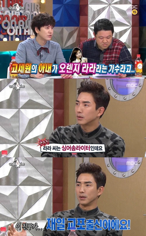 이날 MC들은 “고세원의 아내가 오렌지라라라는 가수라고 들었다”고 말했다. 이에 고세원은 “아내가 가수 활동을 할 당시 소속사가 오렌지펙토리라 오렌지라라라는 예명으로 활동했는데 지금은 소속사를 떠난 상태라 오렌지 빼고 라라가 됐다”고 전했다.