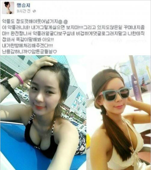 맹승지는 지난 6월 자신의 페이스북을 통해 "악성댓글도 정도껏 해야 웃어넘기지. 야 악플러 너네! 내가 그렇게 싫으면 보지 마! 그리고 있지도 않은 일 꾸며내지 좀 마! 완전 짜증나서 악플러 얼굴 다 보고 싶네. 비겁하게 댓글로 그러지 말고 나한테 직접 와서 똑같이 말해 봐 아오! 내가 한 방에 처리해 주겠다! 난 용감하니까"라고 악플러들에게 경고했다.