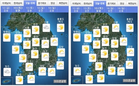 12일 기상청에 따르면 내일(13일)은 중국 북동 지방에서 남동쪽으로 이동하는 고기압의 영향을 받아 중부 지방은 맑겠다.