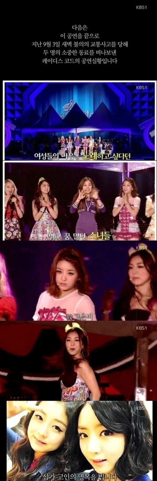 이날 열린음악회 측은 “다음은 이 공연을 끝으로 지난 9월 3일 새벽 불의의 교통사고를 당해 두 명의 소중한 동료를 떠나보낸 레이디스 코드의 공연 실황”이라고 밝혔다.