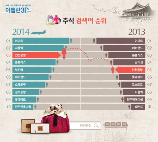 전자지도 소프트웨어 전문기업 맵퍼스(www.atlan.co.kr)는 이번 추석 연휴 기간 중 자사의 내비 앱 ‘아틀란3D 클라우드’의 검색어를 분석한 결과 ‘인천공항’과 ‘김포공항’ 검색어가 전년대비 2배 이상 급증했다고 15일 밝혔다.