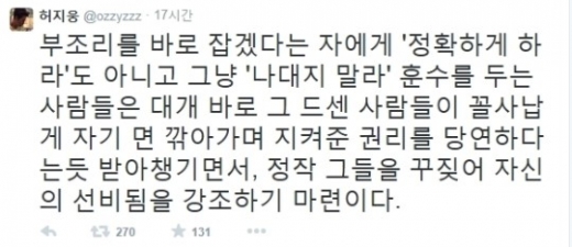 허지웅은 “부조리를 바로 잡겠다는 자에게 ‘정확하게 하라’도 아니고 그냥 ‘나대지 말라’ 훈수를 두는 사람들은 대개 바로 그 드센 사람들이 꼴사납게 자기 면 깎아가며 지켜준 권리를 당연하다는듯 받아챙기면서 정작 그들을 꾸짖어 자신의 선비됨을 강조하기 마련이다”라고 전했다.