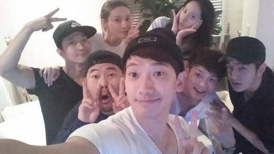 사진 속 비는 ‘내겐 너무 사랑스러운 그녀’ 출연 배우 알렉스, 차예련, 걸그룹 에프엑스 크리스탈, 김진우, 보이그룹 인피니트 엘과 함께 브이 포즈를 취하고 있다.