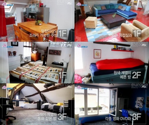 1층엔 넓은 응접실과 주방, 침실을 갖추고 있었고 2층엔 원색계열의 알록달록한 방이 눈에 띄었다. 3층엔 영화 DVD 등을 볼 수 있는 시설까지 갖추고 있어 출연진의 눈길을 끌었다.