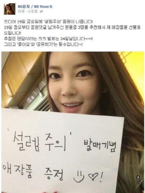 한편,가수 NS윤지(26)가 음원 발매 기념 애장품 선물 공약을 내걸었다.