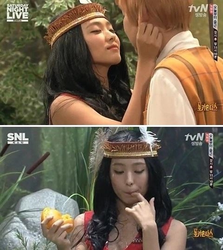 지난 20일 방송된 tvN ‘SNL코리아’에서 씨스타 보라는 섹시한 인디언 소녀로 변신해 신동엽과 함께 꽁트를 선보였다.