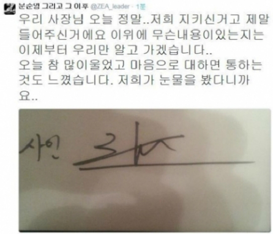 마지막으로 “우리 사장님 오늘 정말 저희 지키신 거고 제 말 들어주신 거에요”라며 신주학 대표의 사인이 담긴 문서를 공개했다.