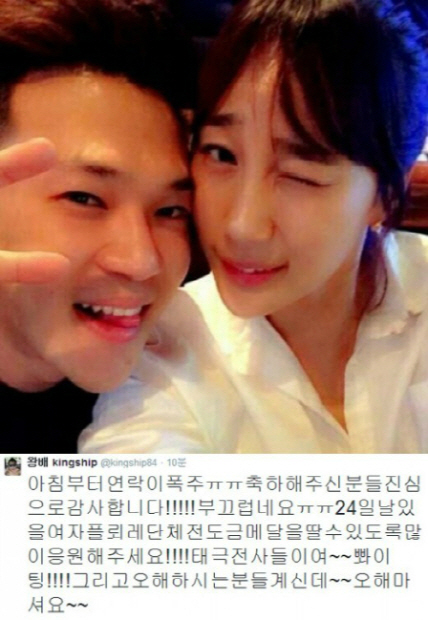 전희숙과 열애중인 방송인 왕배의 연인의 금메달을 염원하는 응원글이 눈길을 끌고 있다.