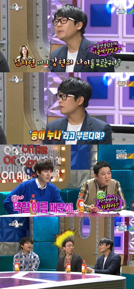 MC들은 “김강현 씨가 나이를 잊고 사나 보다. 전지현씨보다 4살이 많은데 전지현 씨를 송이누나라고 불렀다”며 질문을 던졌다.