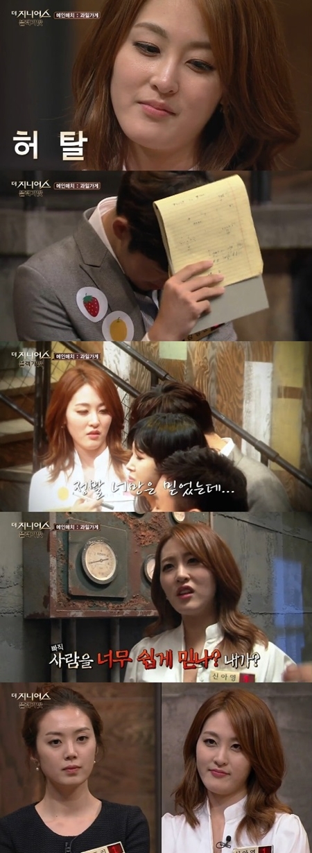 이날 방송에서 신아영은 “나는 정말 아무 것도 모르겠다”라며 김경훈에게 의지했으나 김경훈의 배신으로 탈락위기에 처하고 말았다.