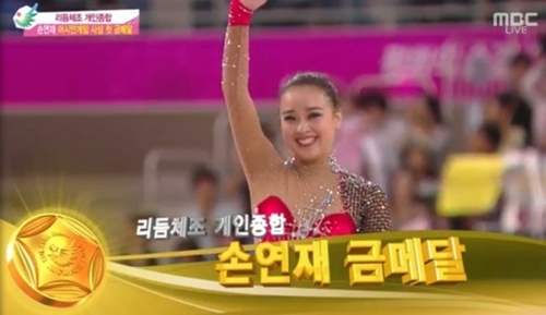손연재는 지난 2일 인천 남동체육관에서 열린 2014 인천 아시안게임 리듬체조 개인종합 결선에서 후프 18.216점, 곤봉 18.100점, 리본 18.083점, 볼 17.300점으로 총합 71.699점을 얻어 금메달을 목에 걸었다.
