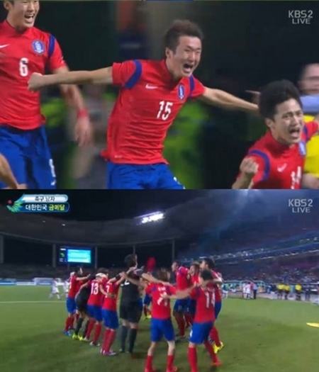 한국 축구 대표팀은 지난 2일 오후 8시 인천 문학경기장에서 열린 2014 인천 아시안게임 남자축구 북한과의 결승전에서 연장 후반 추가시간에 터진 임창우의 극적인 결승골에 힘입어 1-0으로 승리하며 감격스러운 금메달을 목에 걸었다.