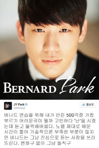 한편 버나드 박의 소속사 JYP엔터테인먼트는 6일 각종 음원사이트를 통해 데뷔 곡 ‘난’을 발표했다.
