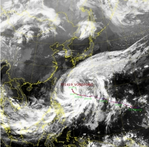 제19호 태풍 봉퐁은 9일 오후 3시 중심기압 910헥토파스칼(hPa), 중심 부근 최대풍속 56m/s의 중형 태풍으로 일본 오키나와 남남동쪽 약 770km 부근 해상에서 10㎞/h의 속도로 북북서진하고 있다.