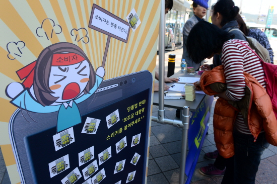 | ▲ 8일 오후 서울 종로구 동화면세점 앞에서 열린 컨슈머워치의 '이동통신단말기유통구조개선법(단통법) 폐지를 위한 소비자 1만명 서명운동' 에서 시민들이 단통법 폐지에 찬성하는 서명을 하고 있다. | ||
