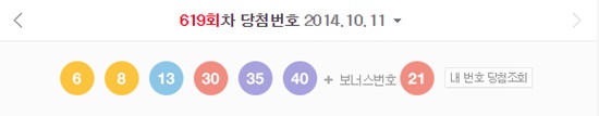 11일 제619회 나눔로또 추첨결과 1등 당첨번호는 6, 8, 13, 30, 35, 40으로 결정됐다.
