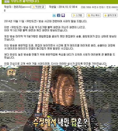 무한도전 방송사고, 제작진 공식사과 "작업에 욕심내다가…사과드린다"