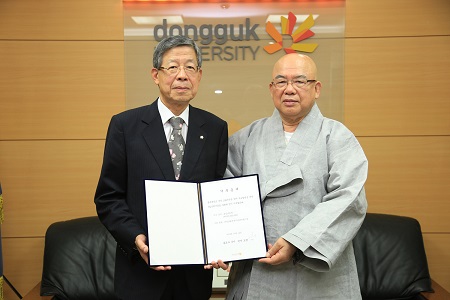 | ▲ 14일 서울 중구 동국대에서 진행된 '건학108주년 기념관 건립기금 전달식'에서 김희옥 동국대 총장(왼쪽)과 원산스님이 기념사진을 촬영하고 있다. | ||