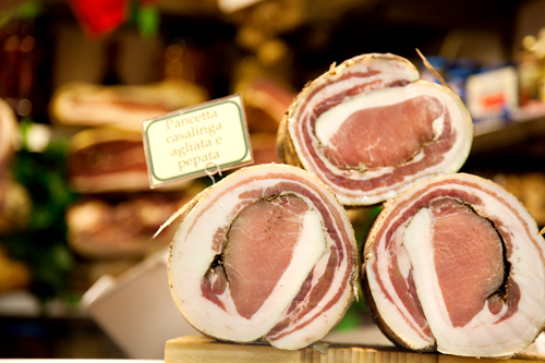 판체타는 돼지 뱃살을 소금에 절이고 후추, 정향 등 향신료로 풍미를 더한 후 숙성시켜 만든 이탈리아식 베이컨이다.