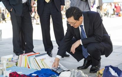 | ▲ 23일 서울 동대문구 서울시립대에서 개최된 '나눔장터'에서 이건 서울시립대 총장이 장터 물품을 살펴보고 있다. | ||