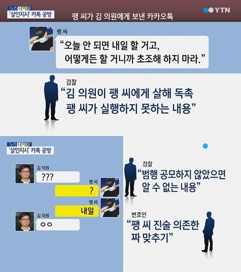 한편 이날 재판에서는 김 의원과 살인 교사를 받은 팽씨의 카카오톡(카톡) 메시지 내용도 공개됐다. 검찰이 공개한 카톡 메시지에 따르면 팽씨는 지난 1월 김 의원에게 "뽀록나면 넌 빠지는 것" 등의 내용을 담고 있다.