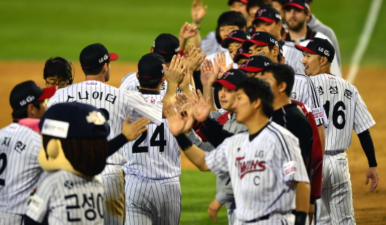 | ▲ 25일 오후 서울 송파구 잠실야구장에서 열린 2014 프로야구 준플레이오프 LG트윈스와 NC다이노스의 4차전 경기에서 11대3으로 승리한 LG 선수들이 환호 하고 있다./뉴시스 | ||