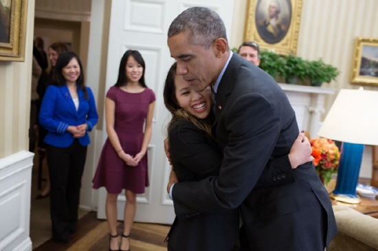 | ▲ 에볼라 확진 판정을 받은 뒤 백악관을 찾은 니나 팸이 버락 오바마 미국 대통령과 포옹을 하고 있다./사진=백악관 홈페이지 | ||