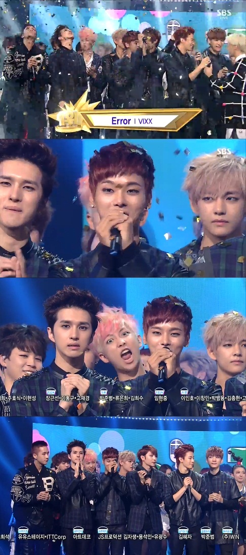 26일 오후 방송된 SBS ‘인기가요’에서는 그룹 빅스의 ‘에러’가 서태지의 ‘크리스 말로윈’, 걸스데이 ‘보고싶어’를 제치고 10월 넷째 주 1위 영광을 안았다.