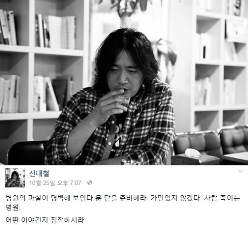 신대철은 "병원의 과실이 명백해 보인다. 문 닫을 준비해라. 가만 있지 않겠다. 사람 죽이는 병원, 어떤 이야긴지 짐작하시라"고 말했다.