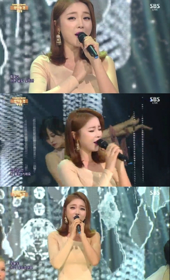홍진영은 2일 방송된 SBS '인기가요'에 출연해 신곡 '산다는 건'으로 컴백무대를 펼쳤다.