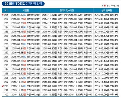 | ▲ TOEIC 2015년 시행 일정. /자료=YBM 한국TOEIC위원회 | ||