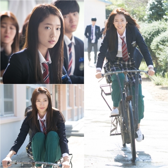 특히 교복 치마 속에 체육복 바지를 입은 패션으로 환한 미소와 함께 자전거를 타는 모습이 눈길을 끌고 있다.