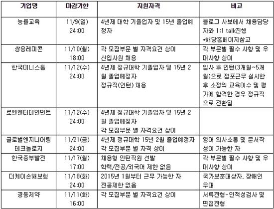 이번달 채용을 마무리하는 회사는 능률교육·쌍용레미콘·한국미니스톱·로엔엔터테인먼트 등 총 8곳이 있다.