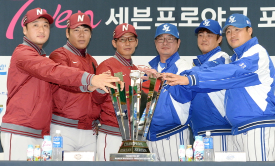 | ▲ 3일 ‘2014프로야구’ 삼성 라이온즈와 넥센 히어로즈의 한국시리즈 미디어데이에서 양 팀 감독과 대표 선수들이 우승 트로피에 손을 올리고 기념촬영을 하고 있다./뉴시스 | ||
