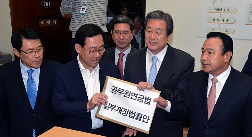 | ▲ 지난달 28일 새누리당 김무성 대표, 이완구 원내대표 등 주요당직자들이 서울 여의도 국회 의안과에 공무원 연금법일부 개정 법률안을 제출하고 있다. /사진=뉴시스 | ||