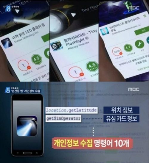 MBC는 5일 "인기 있는 몇몇 무료 손전등 앱이 스마트폰의 각종 개인정보를 몰래 빼내 온 것으로 드러났다"며 "수집된 정보는 여러 해외 광고 마케팅 회사로 전송됐다"고 보도했다.