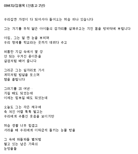 15년 전의 고교생의 시가 중년 네티즌에 회자되는 까닭은 가장으로 집안의 경제를 책임지는 아버지의 처지가 2000년 전후 IMF환란 이후 최악으로 치닫는 당시와 별다름이 없는 머슴격이라는 데 공감한 것에 따른 것으로 풀이된다. [미디어펜=류슬기 인턴기자]