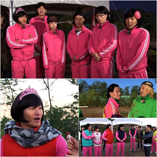 유재석·김종국·하하·개리·이광수 등 '런닝맨' 멤버들은 상큼한 핑크색 트레이닝복에 빛깔 고운 가발을 쓴 채 촬영장에 나타나 큰 웃음을 안겼다.