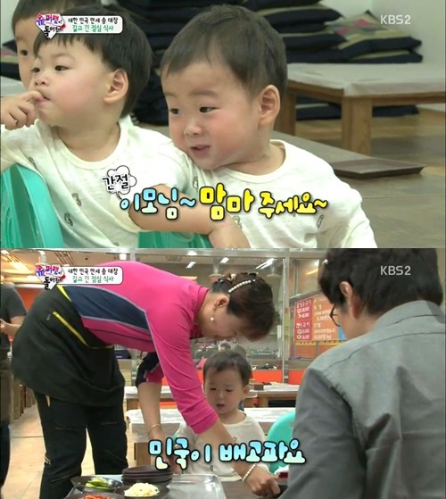 특히 민국이는 "이모님 맘마 주세요. 이모님"이라고 외치는 모습으로 웃음을 자아냈다. 반찬이 나오자 민국이는 "이모님 고마워요"라고 인사하는 귀여운 모습을 보였다.