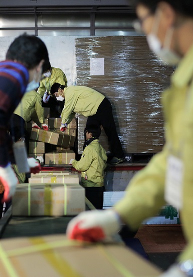 | ▲ 10일 전국 시험 지구별로 배부된 2015학년도 대학수학능력시험용 문제지와 답안지가 대구시 수성구 범어동 대구여자고등학교에 도착해 관계자들이 하역 작업을 하고 있다. /사진=뉴시스 | ||