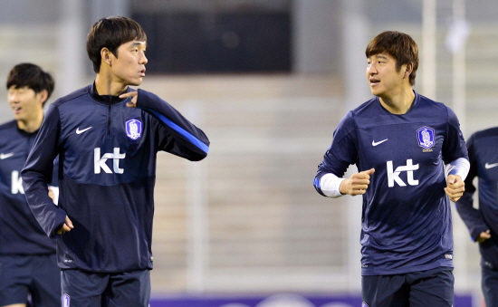 | ▲ 요르단과의 평가전을 하루 앞둔 13일(현지시각) 요르단 암만 킹압둘라 스타디움에서 대표팀 박주영과 박주호과 훈련 중 이야기를 나누고 있다. /뉴시스 | ||