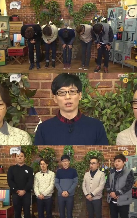 이어 "노홍철 씨도 깊이 반성하고 있으리라 생각한다. 이런 일이 없도록 마음을 바로 잡도록 하겠다. 매주 시청자 여러분께 큰 웃음 드리도록 노력하겠다"고 덧붙였다. 이어 모든 멤버들은 고개 숙여 인사를 했다.