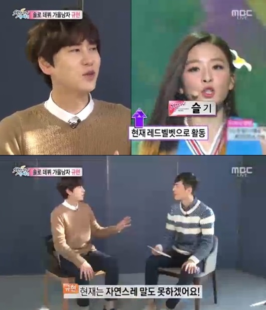 ‘섹션TV 연예통신’에서 아이돌 그룹 슈퍼주니어의 멤버 규현이 소속사 후배 걸그룹 레드벨벳의 멤버 슬기에 대해 언급했다.