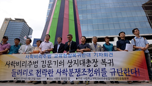 | ▲ 지난 8월25일 서울역 앞에서 상지대 김문기 총장 복귀와 관련해 사립학교개혁과 비리추방을 위한 국민운동본부가 '사학비리주범 교육현장 복귀반대 기자회견'을 진행하고 있다. /사진=뉴시스 | ||