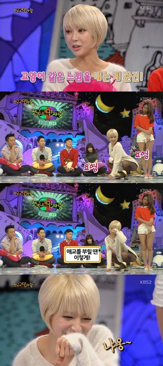 이에 MC 신동엽이 초아에게 "봐줄테니 잠깐 포즈를 취해줄 수 있냐"고 요청하자 초아는 핫팬츠 차림으로 아찔한 포즈를 선보였다. 또 왼손으로 얼굴을 쓰다듬으며 고양이의 애교를 흉내를 내 눈길을 끌었다.