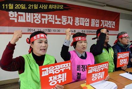 전국학교 비정규직 연대회의는 정규직과의 차별철폐 등을 요구하며 이날부터 21일까지 전국 각 시·도별로 총 파업에 돌입한다고 19일 밝혔다.