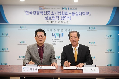 숭실대학교는 메인비즈((한국경영혁신중소기업)협회와 학사과정 계약학과인 '벤처경영학과'를 공동 개설하는 협약(MOU)을 21일 체결했다.