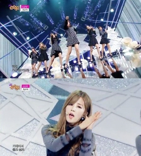 이날 방송에서 에이핑크는 먼저 발라드곡 ‘시크릿’으로 풍부한 가창력을 뽐냈다. 이후 이어진 ‘luv’ 무대에서는 도트 무늬가 그려진 시스루 의상을 입고 성숙미를 과시하며, 독특한 포인트 안무인 엘(L)자 손 안무로 팬들의 관심을 이끌었다.